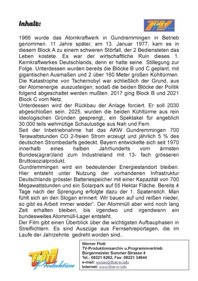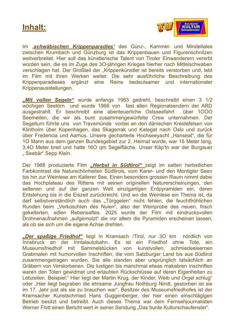 Werner Flott‘s Reportagen sind ausschliesslich zwischen 1995 und 2011 in Burgau gedreht (der Fasching sogar in den 60er Jahren) und in seiner Sendung „das bunte Kulturschaufenster“, für die er eine eigene Lizenz hatte, ausgestrahlt worden. Bunt ist die Themenpallette vom Kanzlerbesuch Kohl, den historischen Festen, der Einrichtung heimischer Museen im renovierten Schloß und Stadtturm, dem Streit um die ehemalige Turnhalle, deren Renovierung und Neugestaltung als Kulturtempel mit dem Namen Kapuzinerhalle und schliesslich dem, das Burgau 1961 europaweit bekannt gemacht hat: Die Burgauer Depesche von Oesterreichs Aussenminister Kreisky, in der die Rückgliederung Burgaus an Oesterreich verbrieft wurde. Es war die trotzige Antwort auf den Verlust des Amtsgerichts. Der große öffentliche Widerhall dieses Vorganges führte schließlich zum „Orden wider den tierischen Ernst“ für Dr. Bruno Kreisky in Aachen. Eine nostalgische Reise in die Vergangenheit.