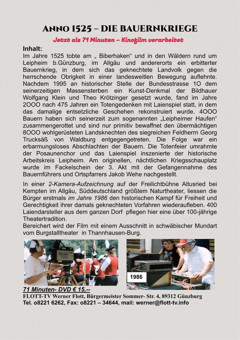 Jahren durch FLOTT-TV stand fest, dass der enorme Bestand an Kultur-Reportagen aus der Region, die z.T. Jahrzehnte alt sind, in Matinees und auf DVDs der